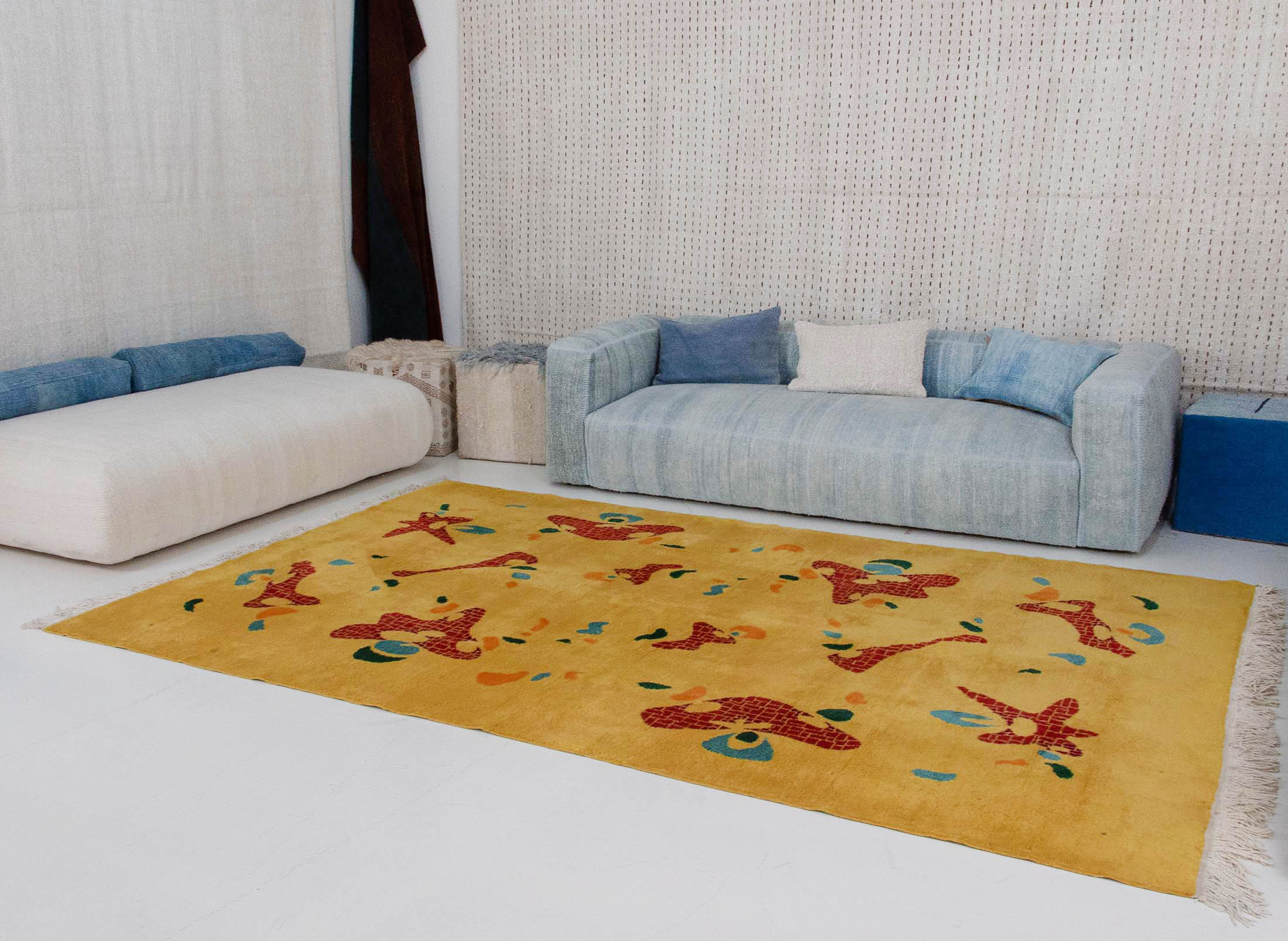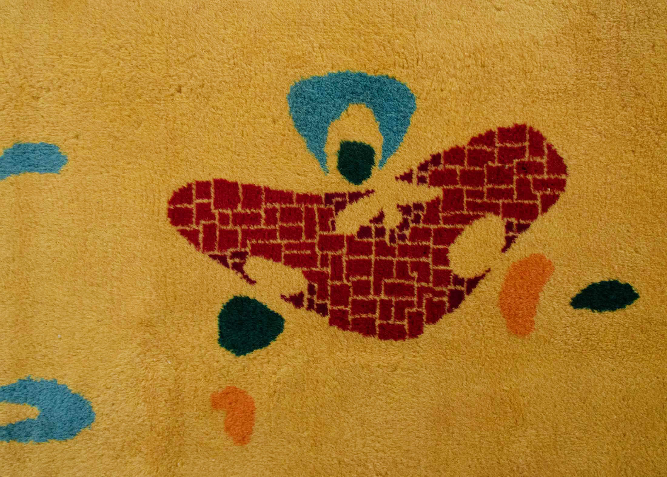 This Abstract Pattern Yellow Rug showcases a 70’s modern design with abstract shapes and a vibrant color scheme on a yellow background.