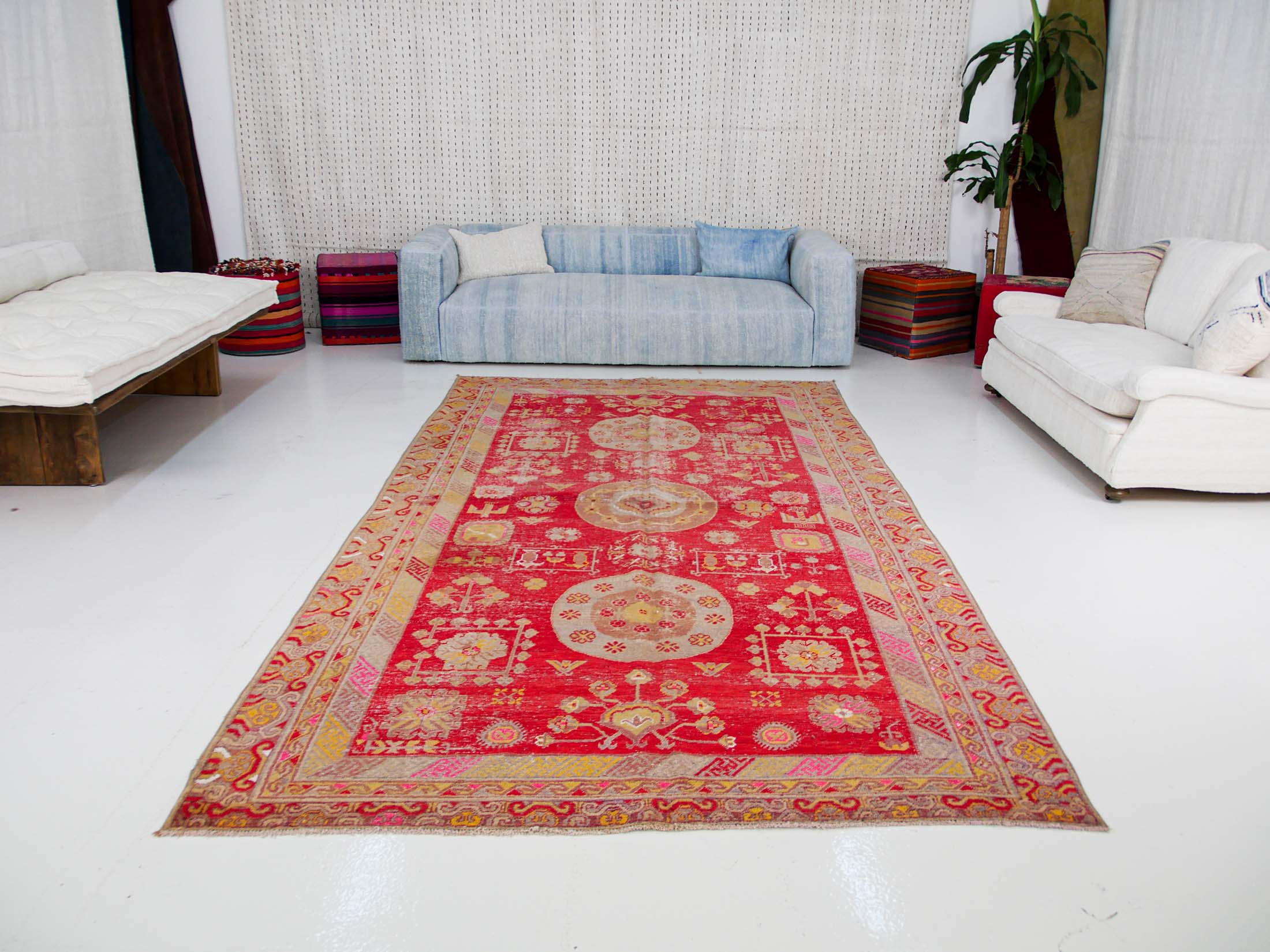 The colors of Khotan rugs are typically softer, featuring hues like soft yellow, rust red, and various shades of blue. The designs often incorporate geometric patterns and abstract drawings, with a color palette that ranges from rich colors to soft pastels2. The rugs are known for their elongated shapes, with the length usually being nearly twice that of the width