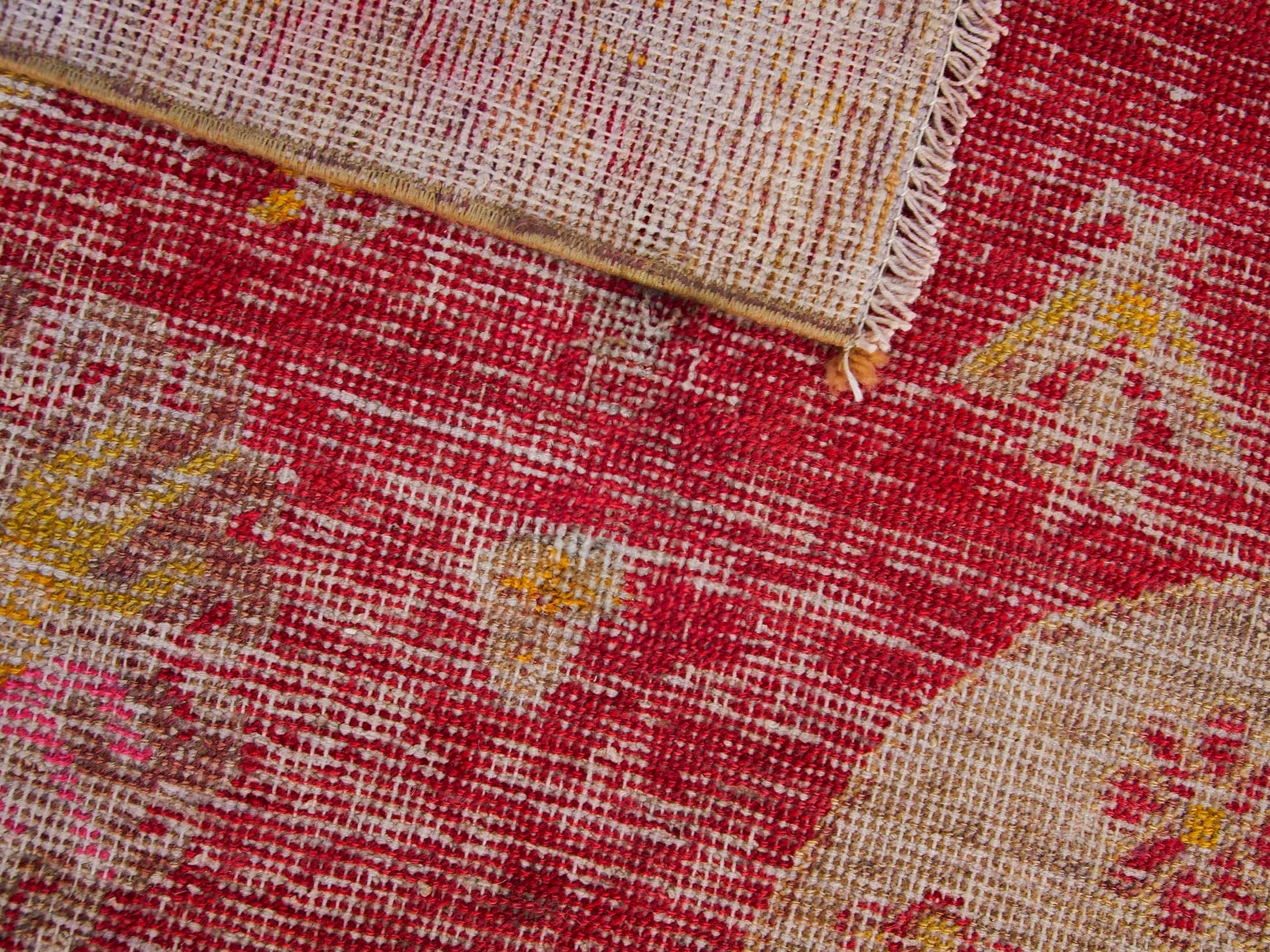 Khotan rugs are crafted using an asymmetrical knotting system with a medium-low density of knots. The foundation is usually made of cotton, while the pile can be wool or silk, sometimes with metallic threads woven in. The pile is generally trimmed to a medium-low height to create a distinctive finish