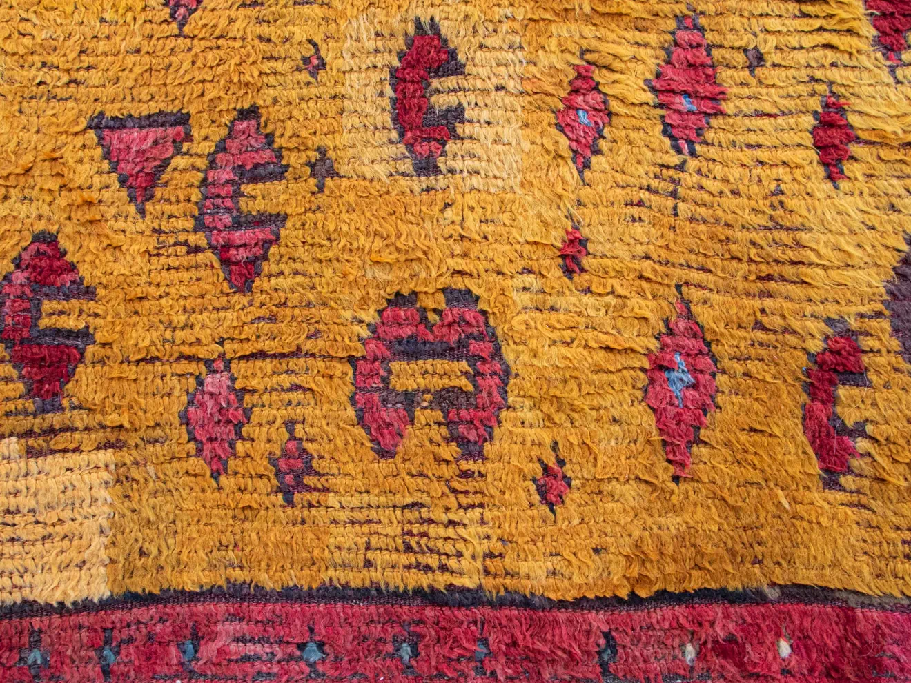 This antique Tulu is a captivating tapestry woven with vibrant hues. Imagine a fiery red border embracing a sunlit golden orange expanse, both colors dancing in irregular tribal geometric patterns. The plush organic wool, over a century old, invites your bare feet to sink in and feel the whispers of time. Archaic designs, woven with practiced hands, add depth and intrigue to this stunning piece.