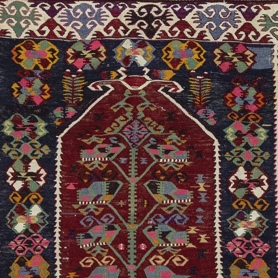 Introducing our exquisite Antique Turkish Accent Handmade Kilim Rug – Prayer Mat, a true masterpiece that will add a touch of elegance to any space. This rug showcases a beautiful combination of red, black, and ivory colors, creating a mesmerizing design that captivates the eye.