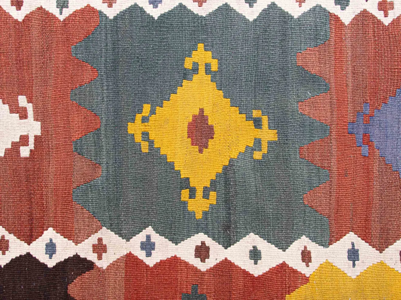 Circa 1920-40’s. Its handwoven tapestry explodes with the vibrancy of a spring meadow, each square a kaleidoscope of sunny yellows, fiery reds, cool blues, and verdant greens. Inside each square, playful diamond patterns dance, adding a layer of intrigue and depth to this whimsical masterpiece. This isn’t just a rug; it’s a portal to Anatolian artistry, inviting you to experience a world of boundless energy and joyful hues.