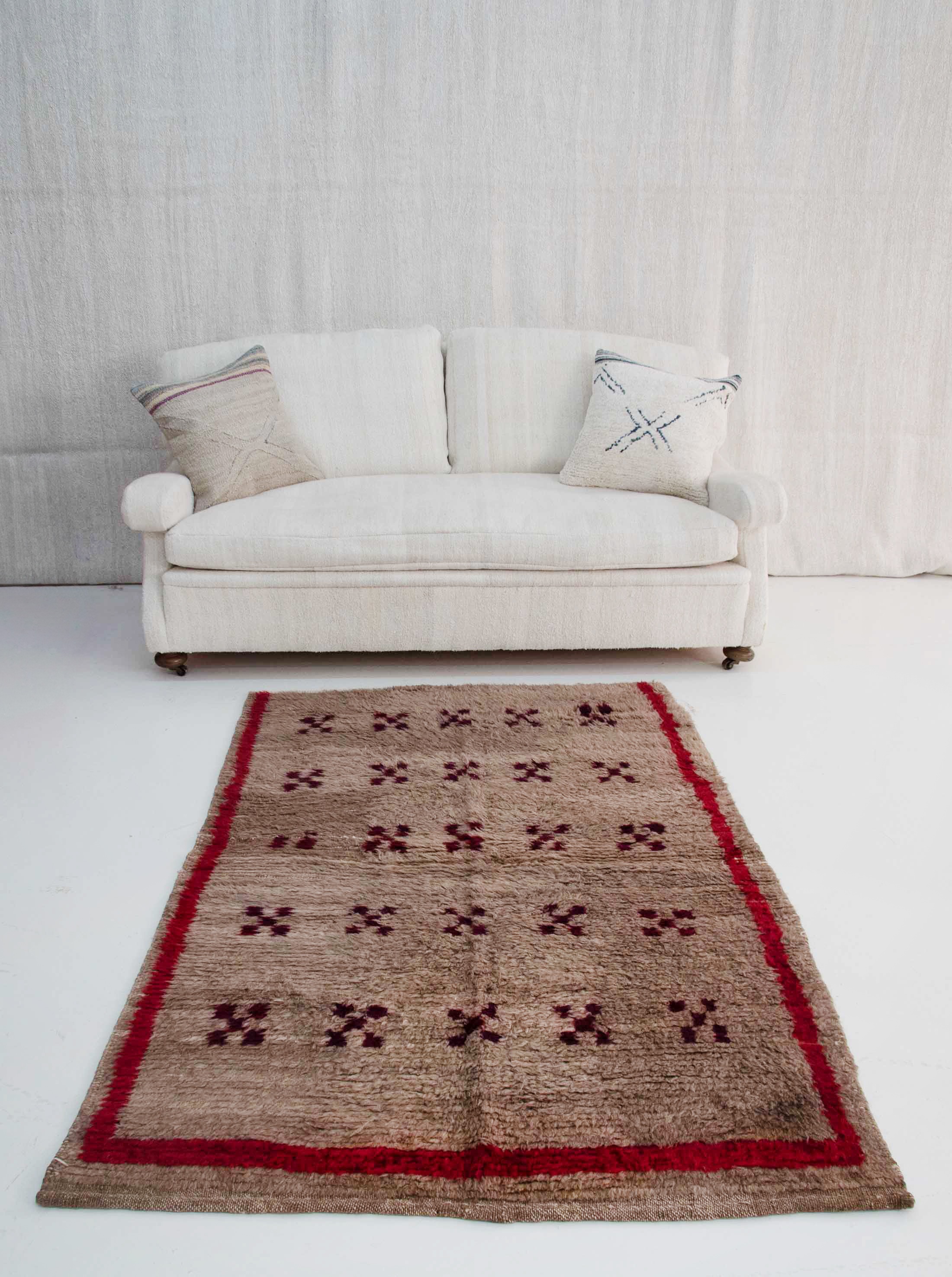 Handwoven from the finest wool, Authentic Vintage Turkish Tulu Rugs often incorporating the lustrous, curly hair of Angora goats, known as mohair, to create its distinctive long-piled, shaggy texture.