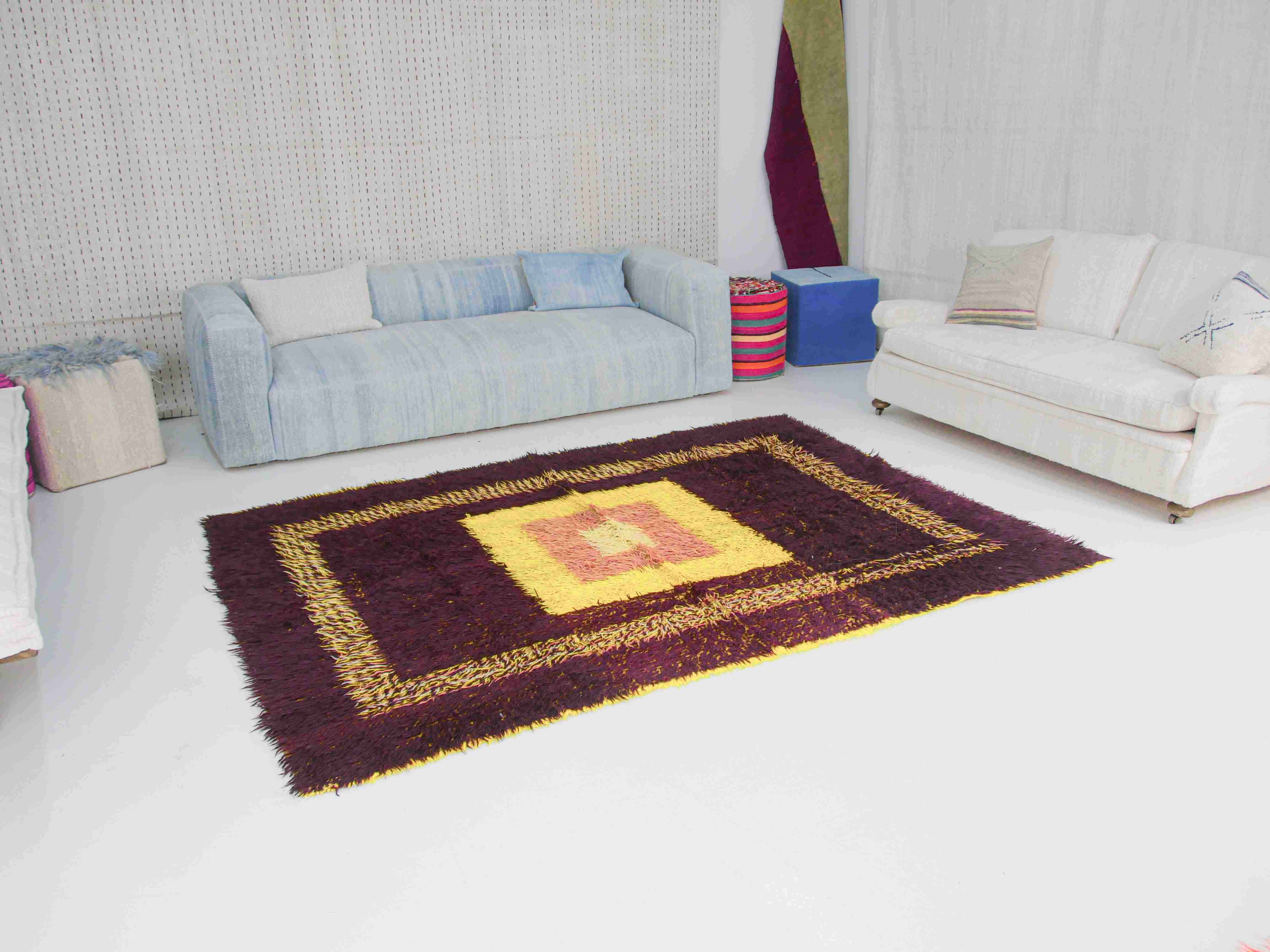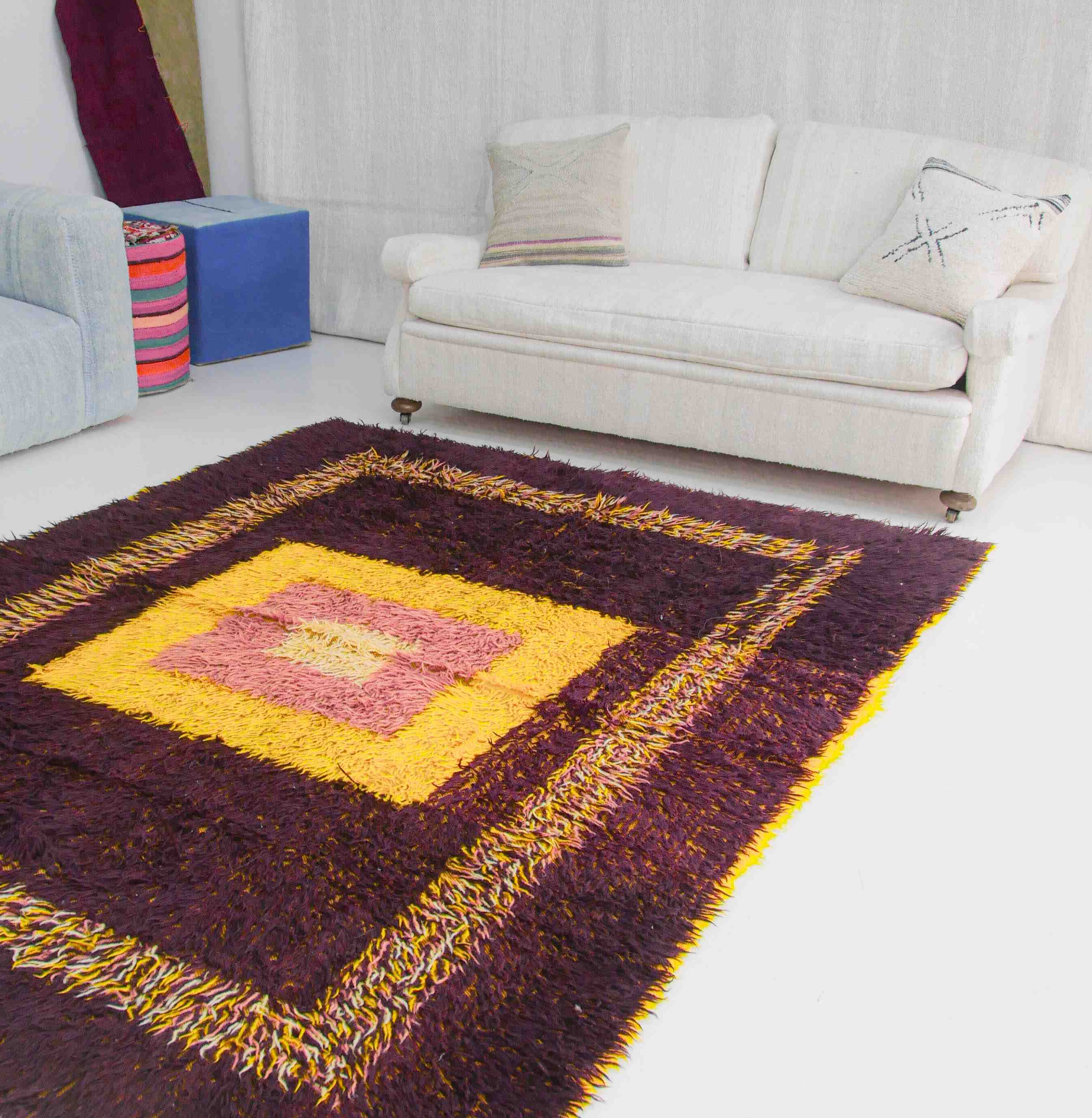 Handwoven from the finest wool, Authentic Vintage Turkish Tulu Rugs often incorporating the lustrous, curly hair of Angora goats, known as mohair, to create its distinctive long-piled, shaggy texture.