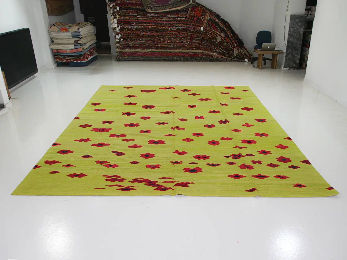 Imagine a meadow bathed in the warm glow of a summer sun, each poppy an explosion of crimson and jade, its delicate petals dancing on the wind. This kilim captures that essence, its irregular poppy patterns dancing across the field, each one a unique expression of artistic freedom. Subtle pastel greens whisper amidst the vibrant blooms, adding a touch of tranquility to the joyous symphony of color.