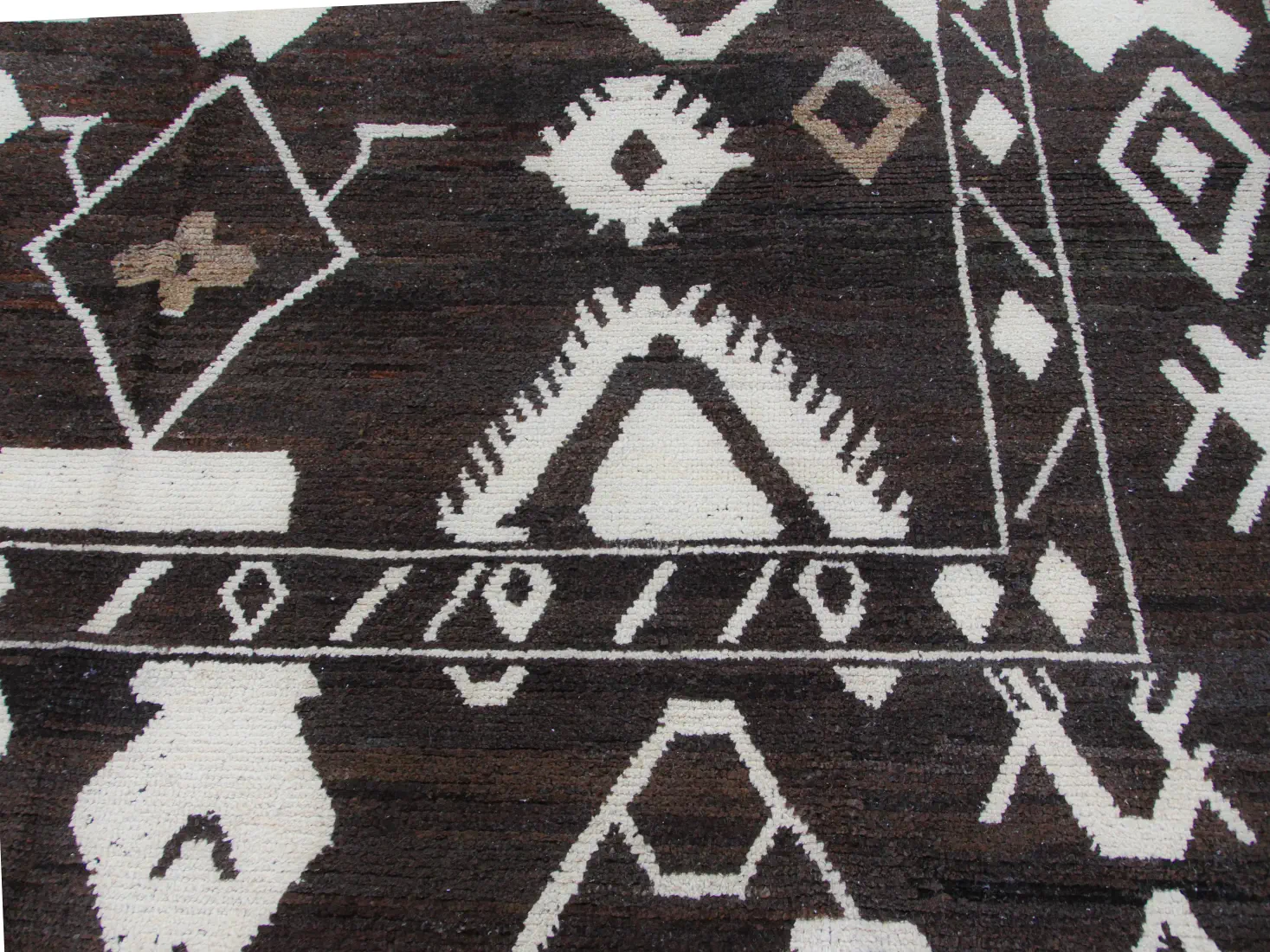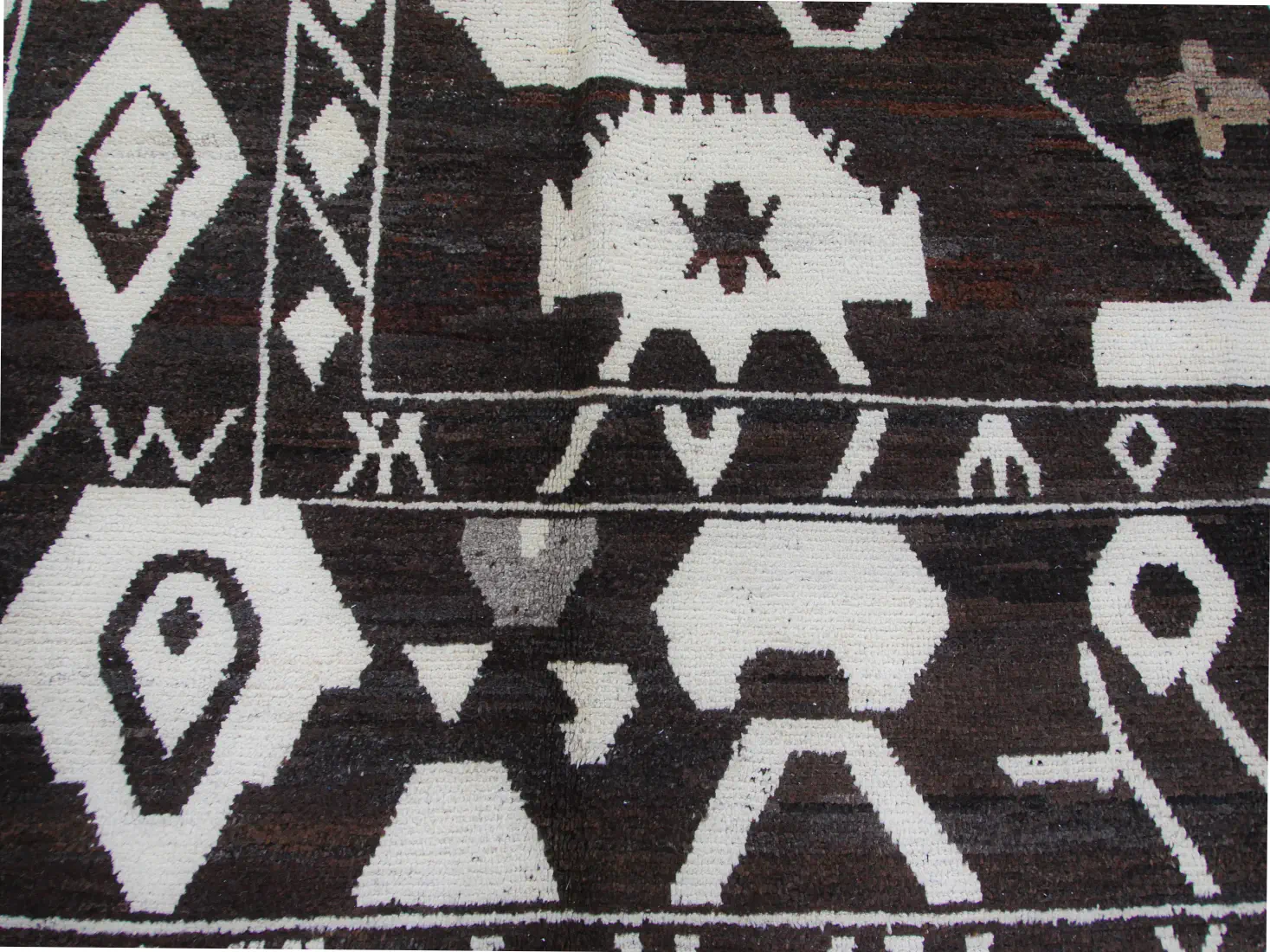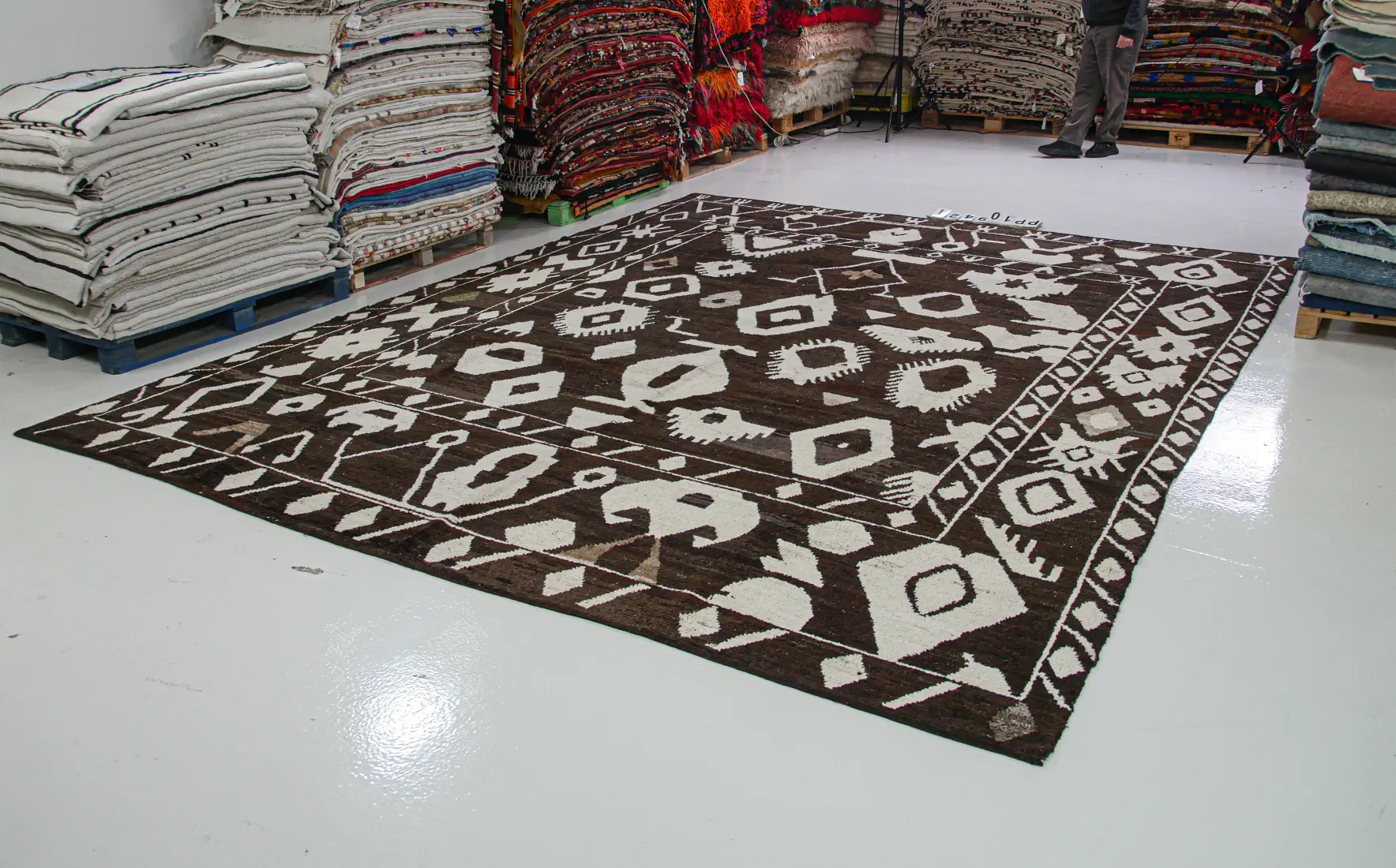 This Handmade Large Brown old Hemp and Wool Rug is a symphony of woven textures and bold geometric play. Imagine stepping onto a Nomad’s treasured map, each loop and line telling tales of ancient journeys. The rich earth tones, swirling like desert winds, invite bare feet to sink into the plush embrace of old Hemp and wool.
