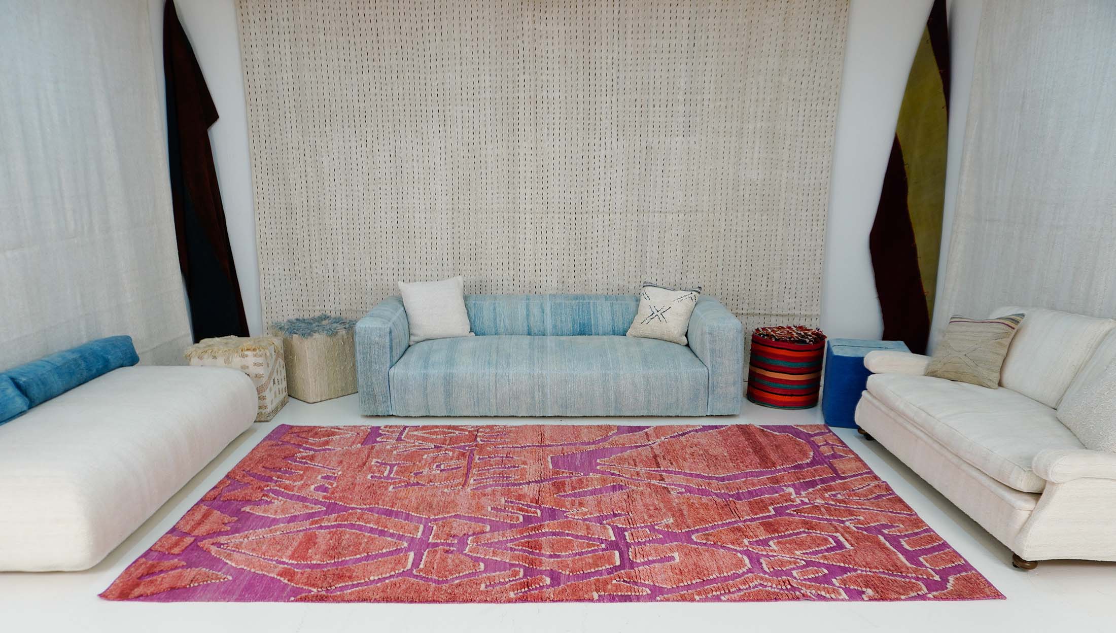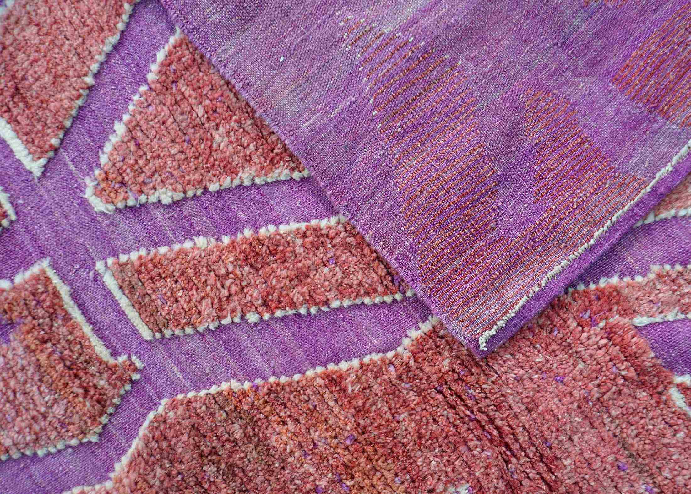 At the heart of this rug lies a captivating arrangement of red and purple shades, forming an abstract pattern that speaks volumes of its geometric elegance. The Triangles rug is not just a floor covering; it’s a statement piece that commands attention, measuring an expansive 204×340 cm (6.69×11.15 ft). Its design is a nod to both the future and the past, embodying a timeless appeal that transcends trends.