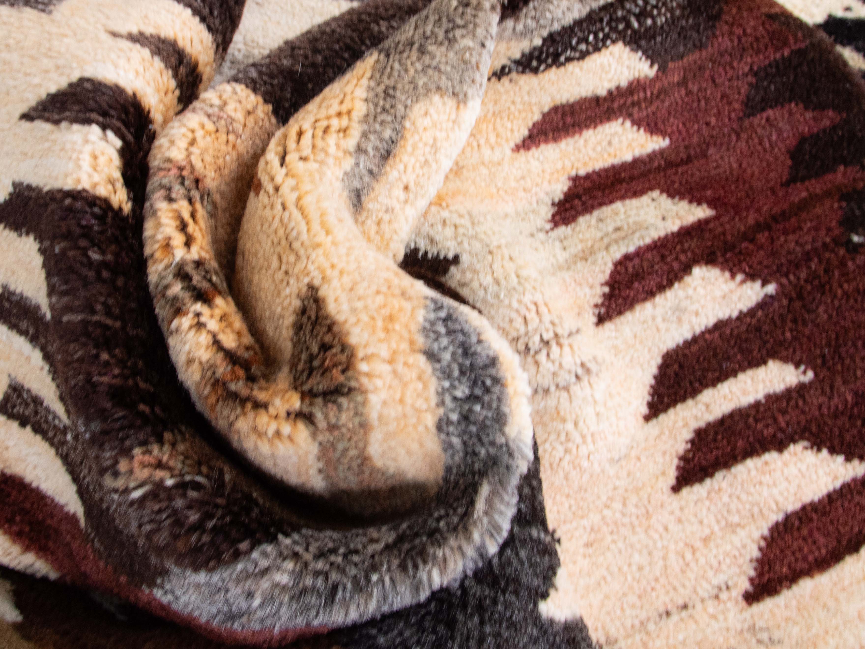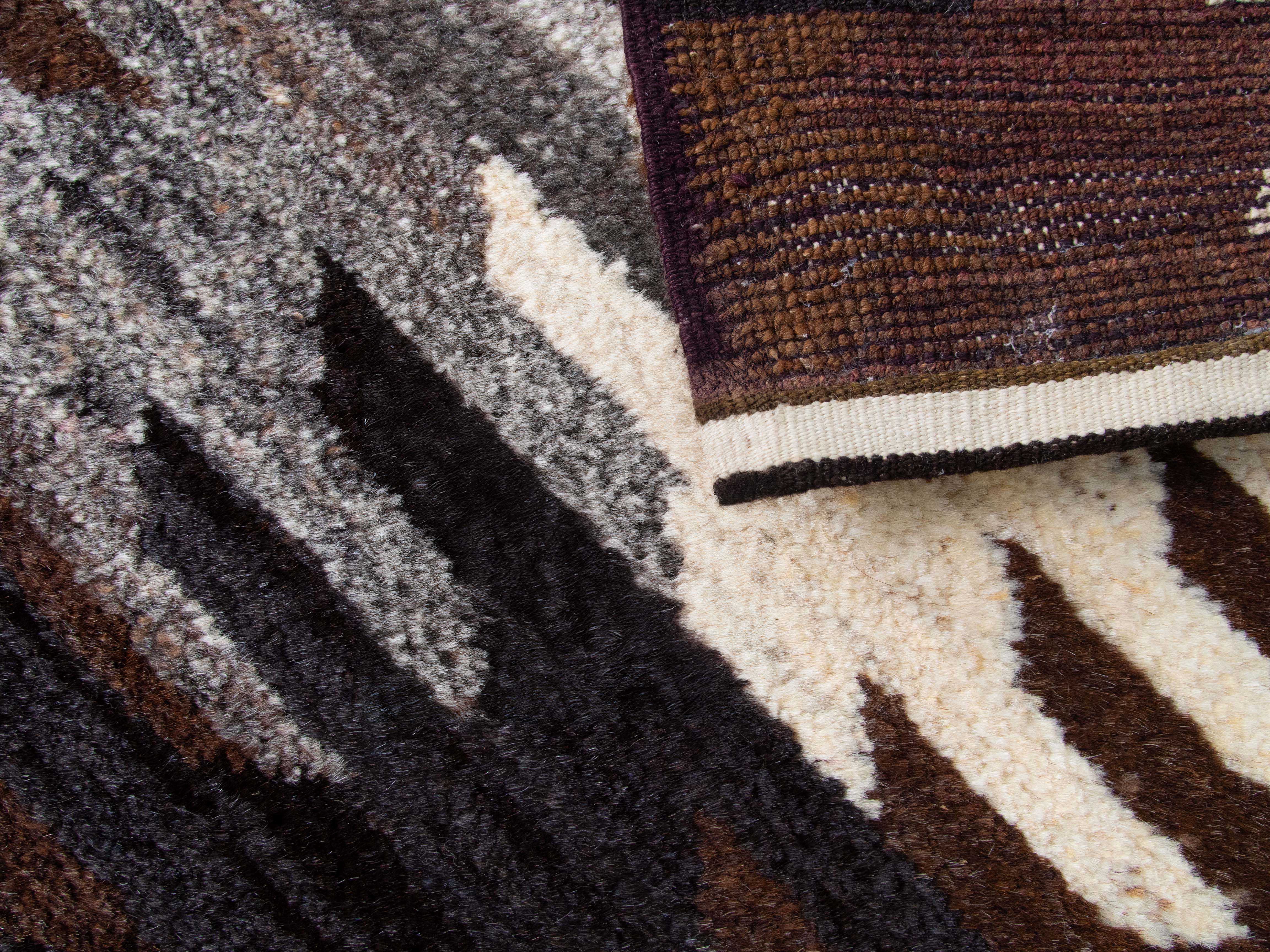 This Handmade Turkish Rug is a modern designer rug with a brown and ivory tones abstract pattern with a repeating of tree like shapes. It features a variety of colors, including brown, ivory, beige and white. The colors are arranged in a row, creating a sense of movement and energy. The rug also has a medium pile, which gives it a dynamic and luxurious texture.121×180 cm 3.96×5.90 ft – 2.18 m2