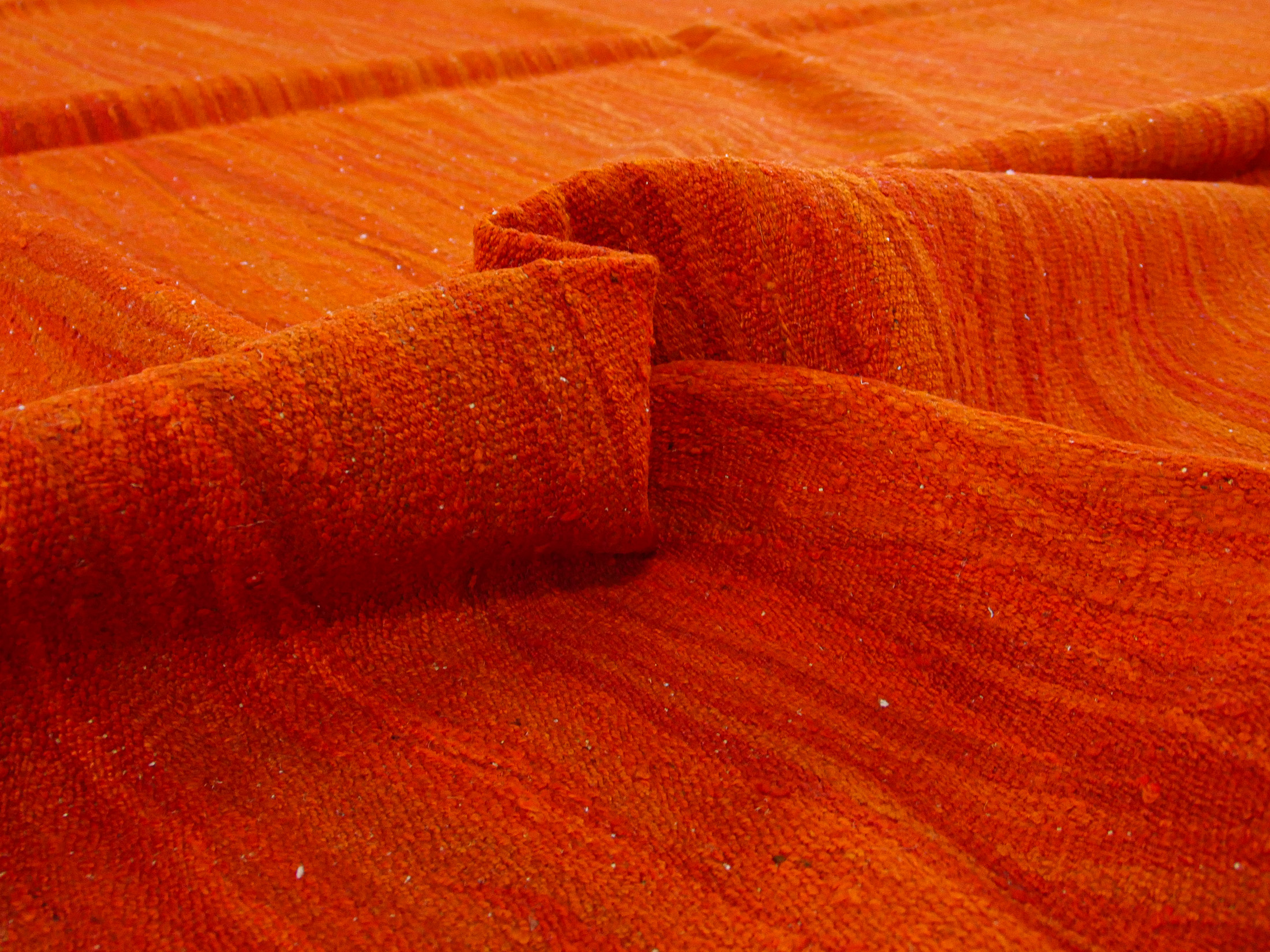 Keywords: kilim rug, handmade rug, recycled yarn, orange rug, red rug, sustainable rug, bohemian rug, conversation piece, cozy rug, handspun yarn, unique home decor, ethical rug, Knotisse Fine Weavings