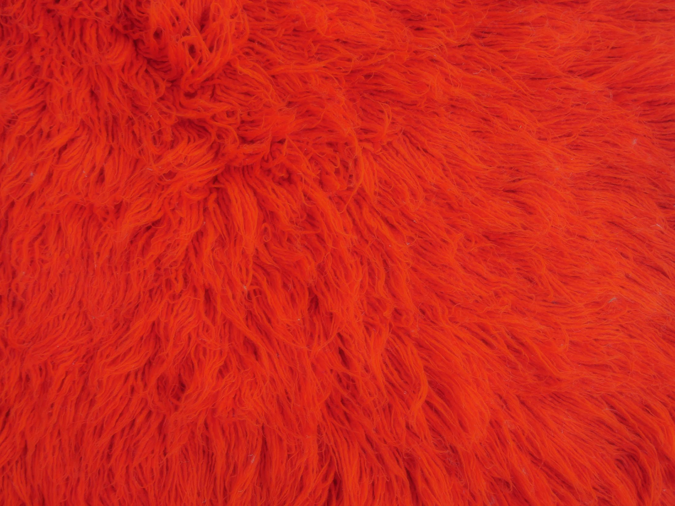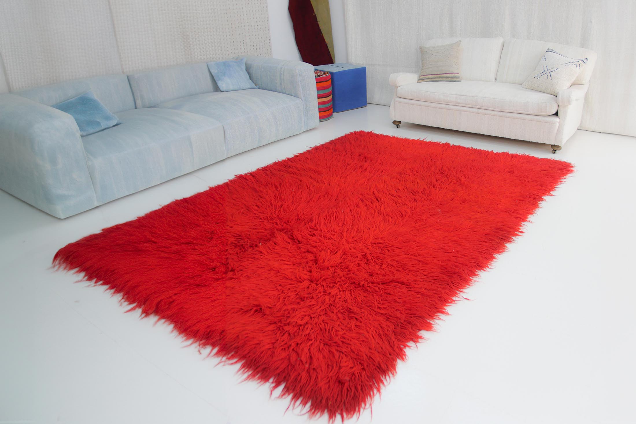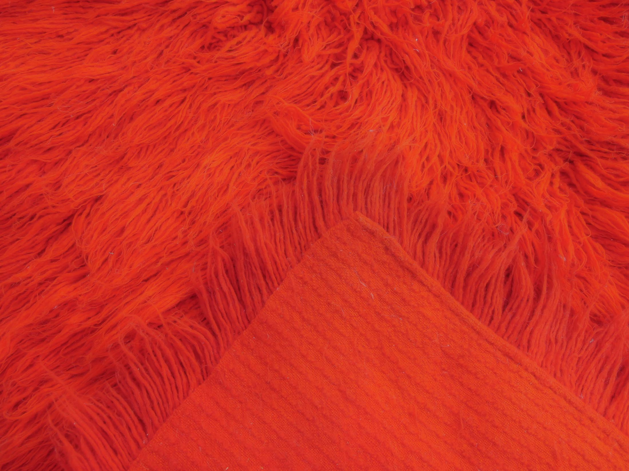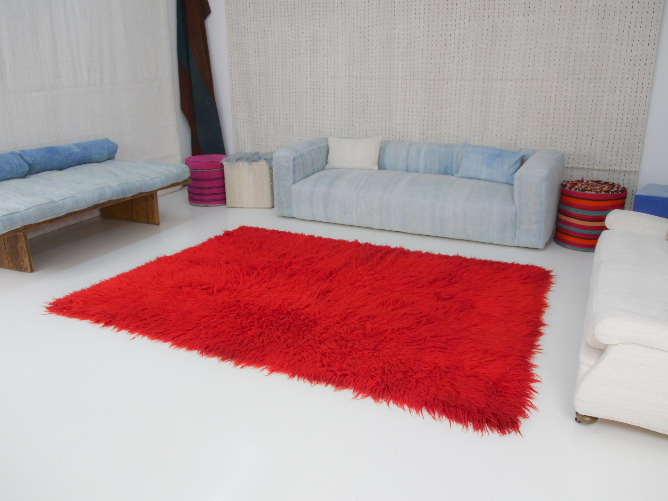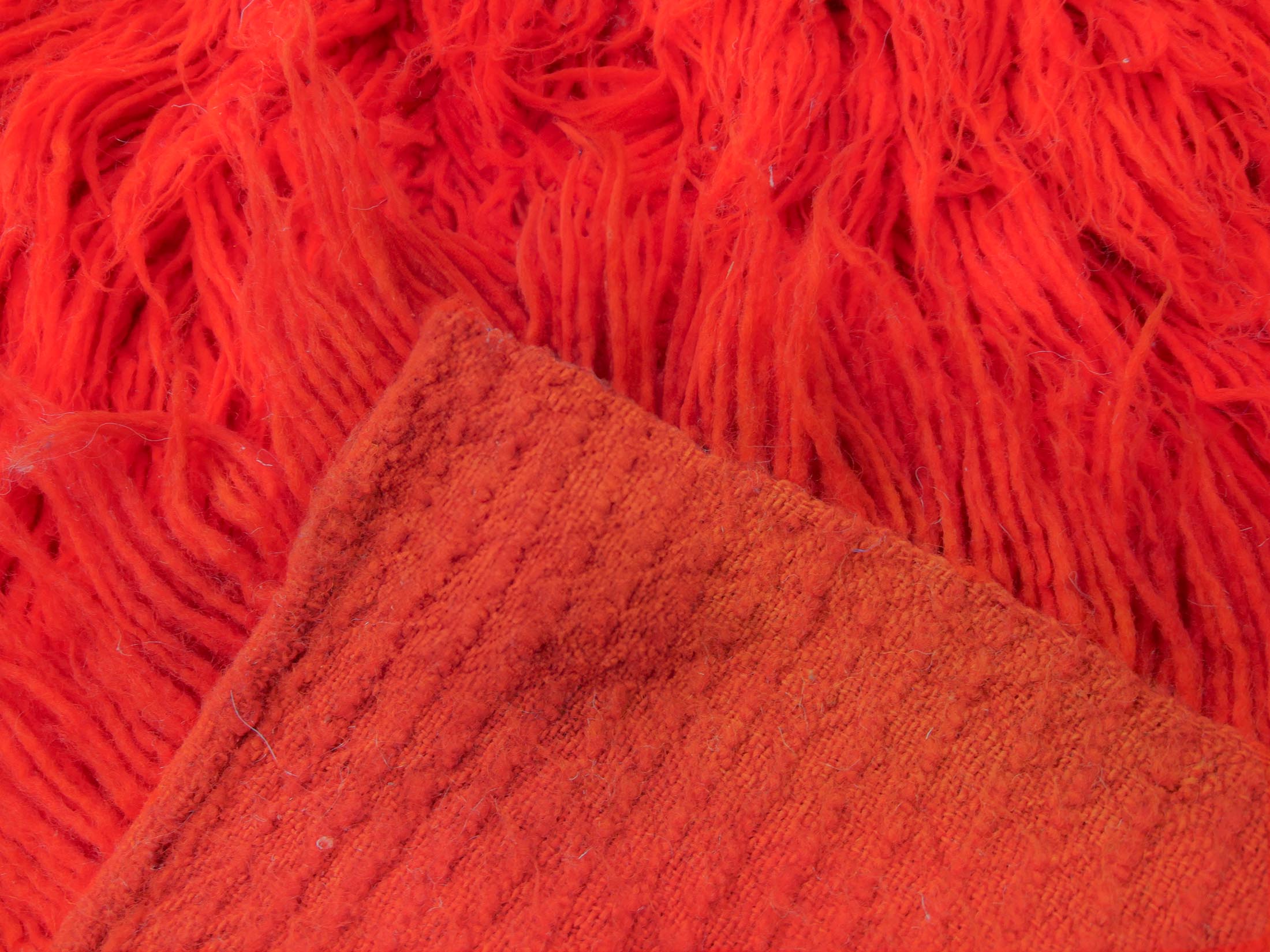 This Handwoven Vintage Turkish Tulu Rug, Solid Red Color whispers in shades of sun-kissed earth with its playful red color and extra high shaggy piles