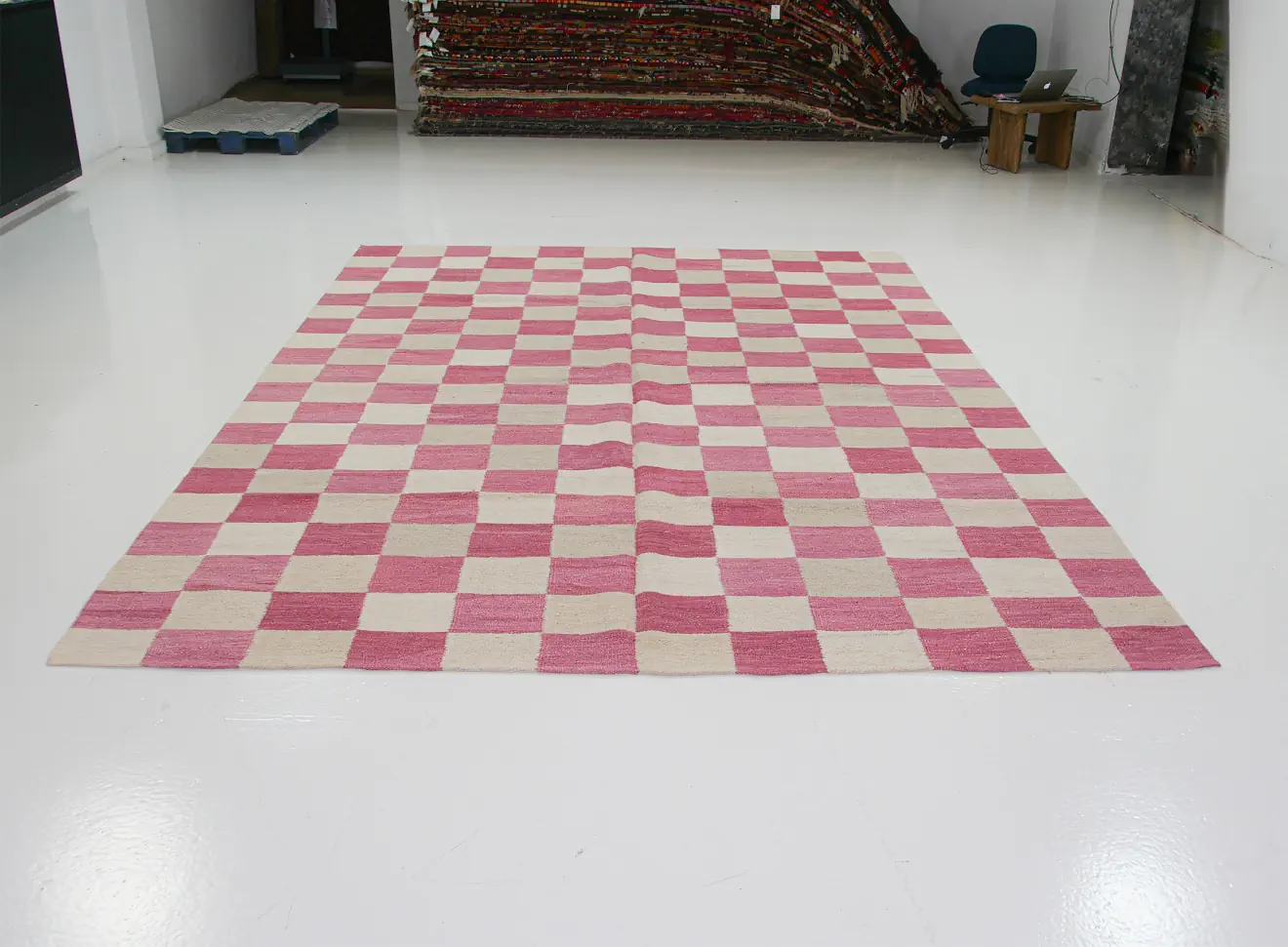 Checkmate: Joyful Pink color Checkered Kilim Rug (8×11 ft)