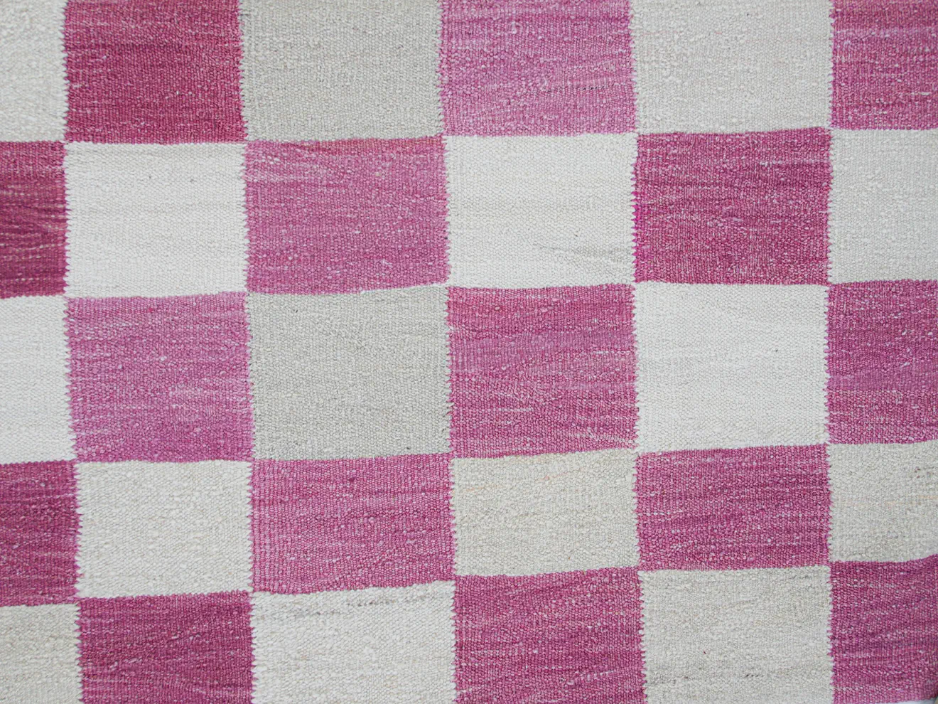 Add a touch of elegance and warmth to your home with this pink checkered kilim rug, designed and produced by Knotisse Fine Weavings. This rug is made from old yarns that have been hand-dyed and hand-woven into a flatweave pattern, creating a unique and durable piece of art.