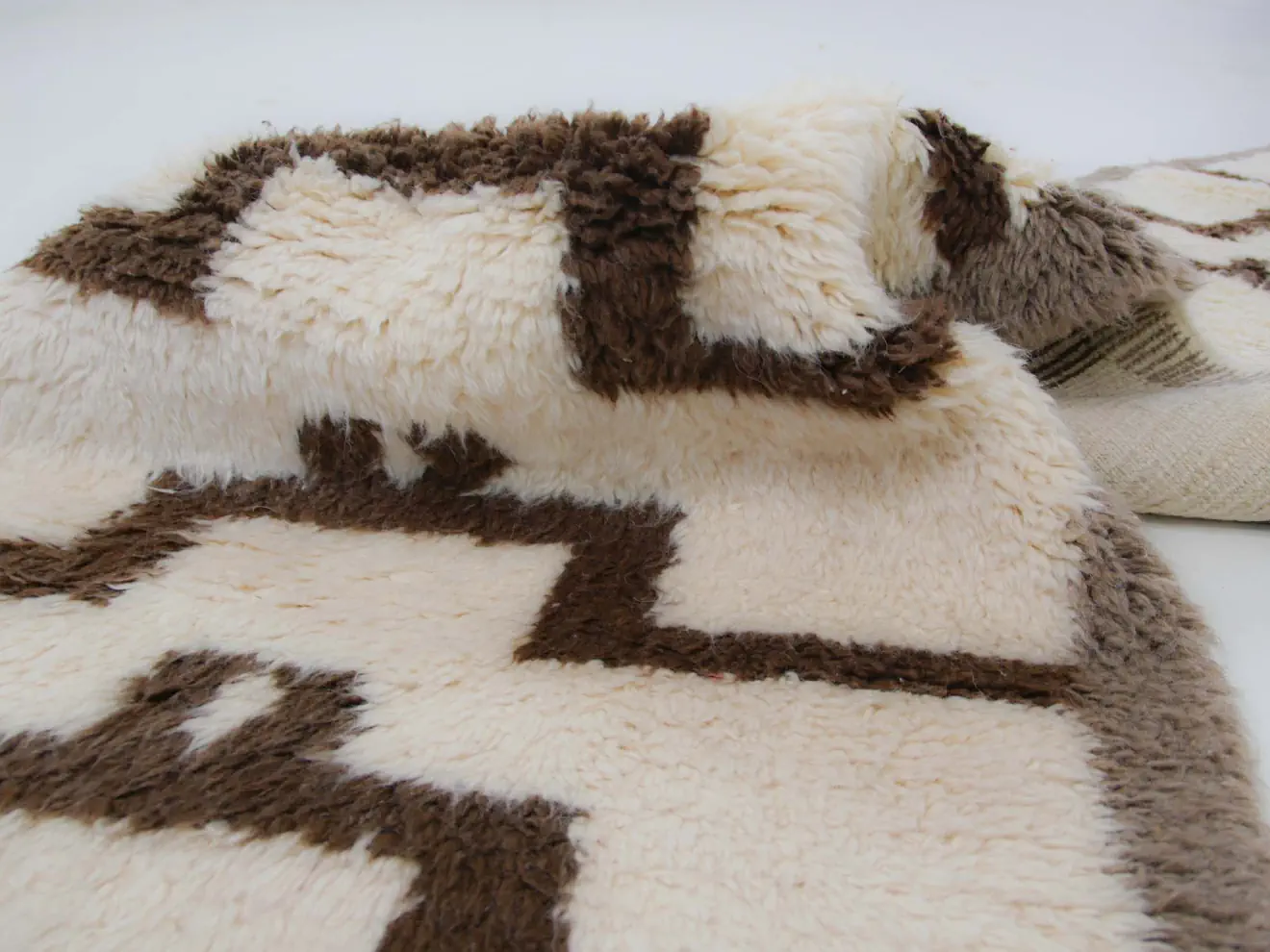 This Handwoven Tulu Runner Rug whispers sophistication in tones of rich earth. Imagine a beige canvas adorned with a captivating cascade of paved diamonds, each one meticulously crafted in warm browns. The high pile wool begs your touch, inviting bare feet to sink into its plush embrace. A light brown frame completes the look, adding a touch of timeless elegance.