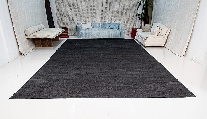 Interior Design Professionals, Take Note: Elevate your spaces with the enduring charm and eco-conscious ethos of our Handwoven matte black color hemp Kilim, crafted from vintage hemp yarn. This natural fiber boasts unparalleled durability, breathability, and a captivating warmth that transcends trends.