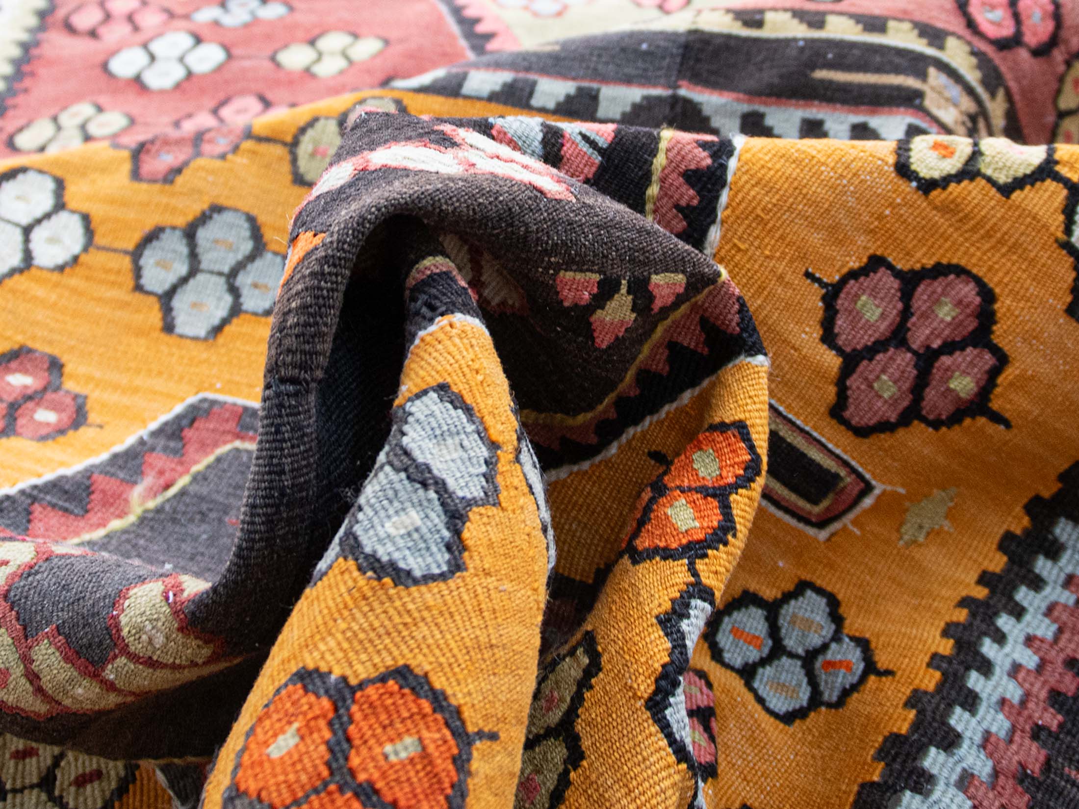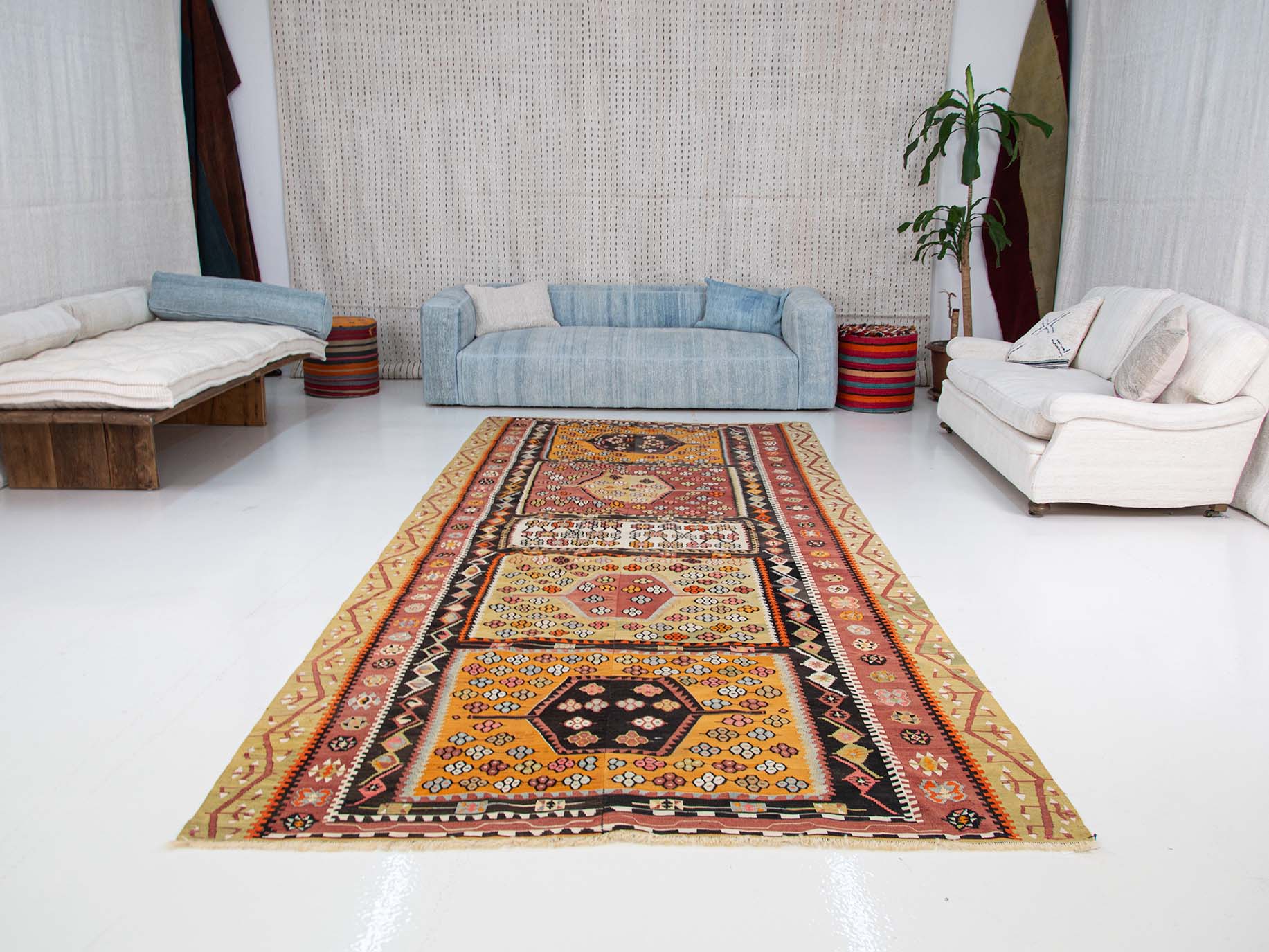 Terracotta dreamscape ✨ This Anatolian kilim runner rug boasts a stunning blend of warm hues – terracotta, yellow, orange, and brown – arranged in captivating archaic patterns.