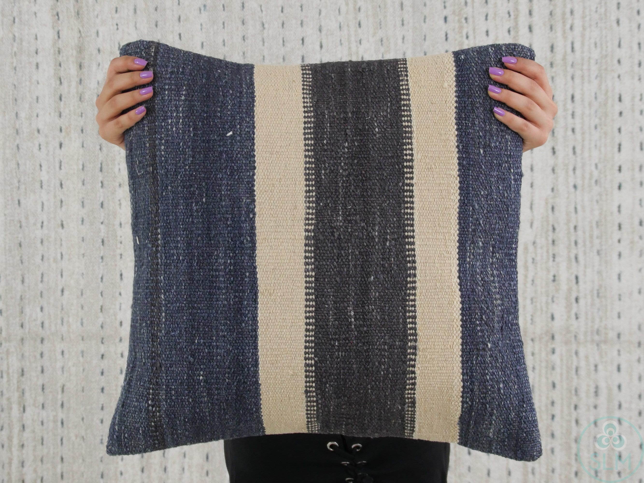 This navy blue black, ivory color bold striped pillow cover was handmade from wool kilim rugs.
