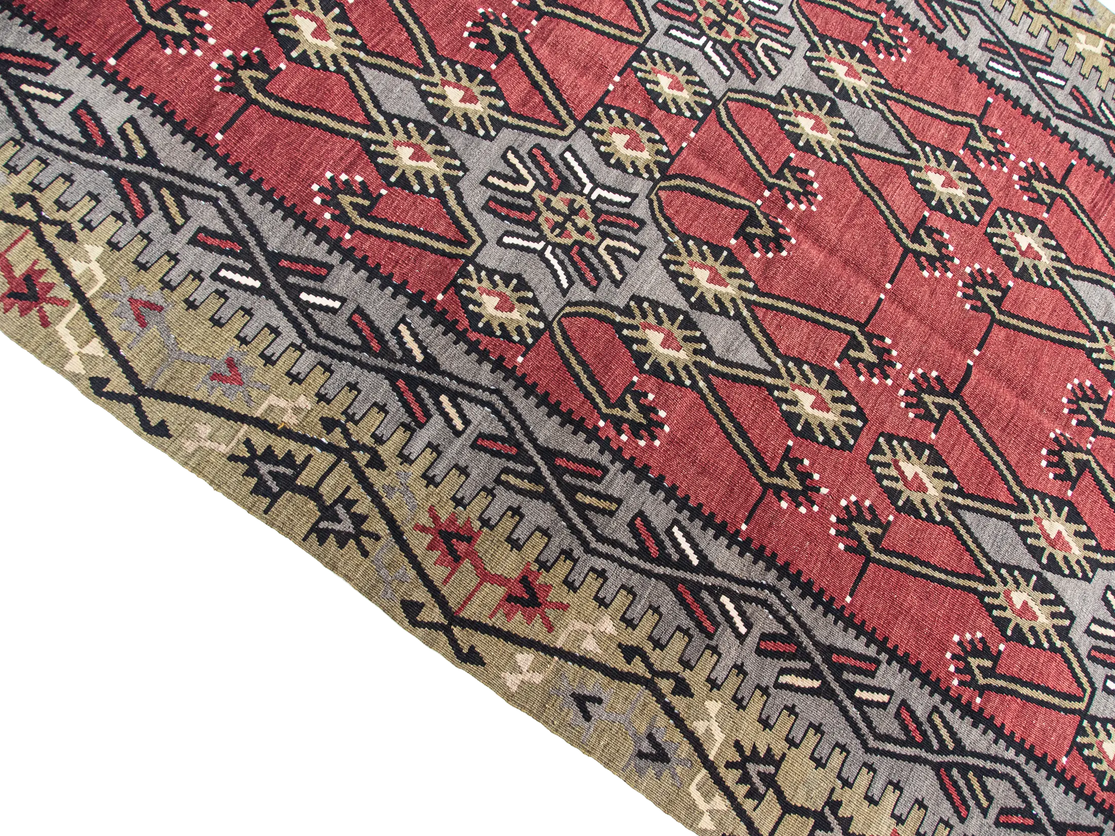 Add a touch of vintage charm and bohemian flair to your home with this beautiful handwoven wool kilim rug runner. The rich red hue and geometric patterns are sure to make a statement in any room.