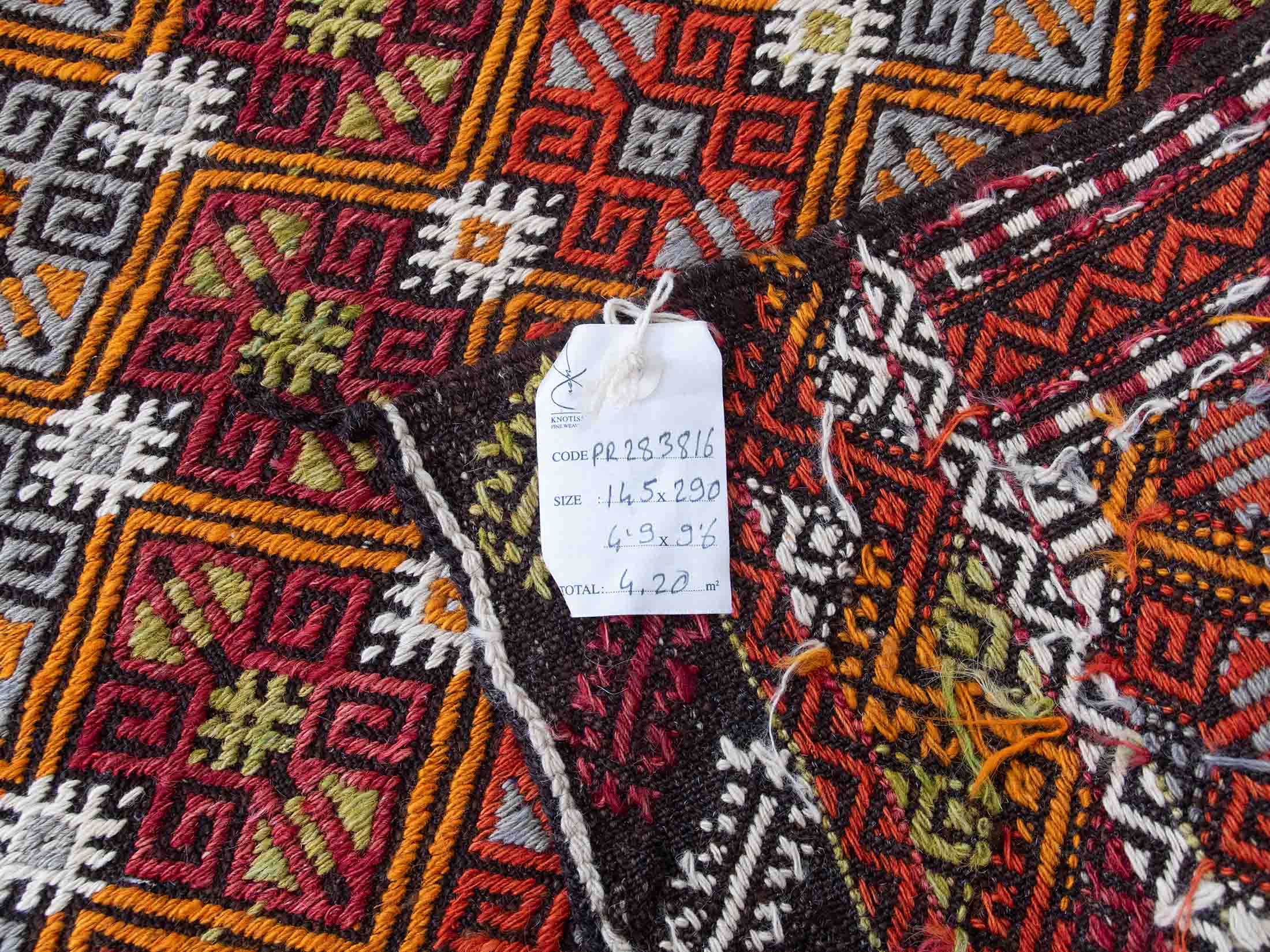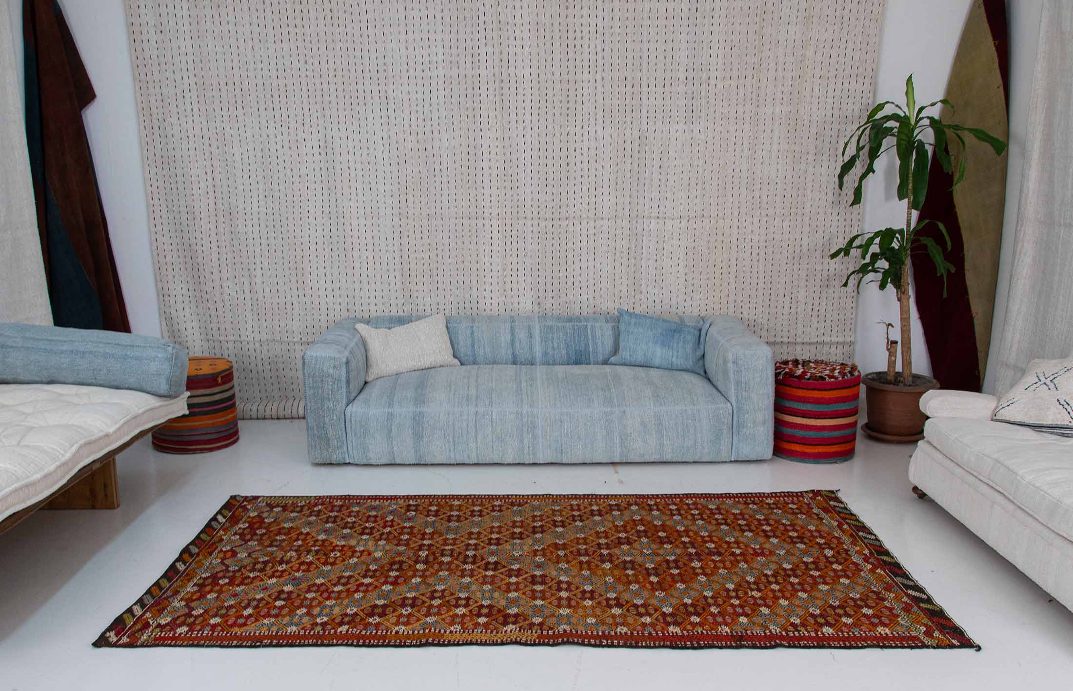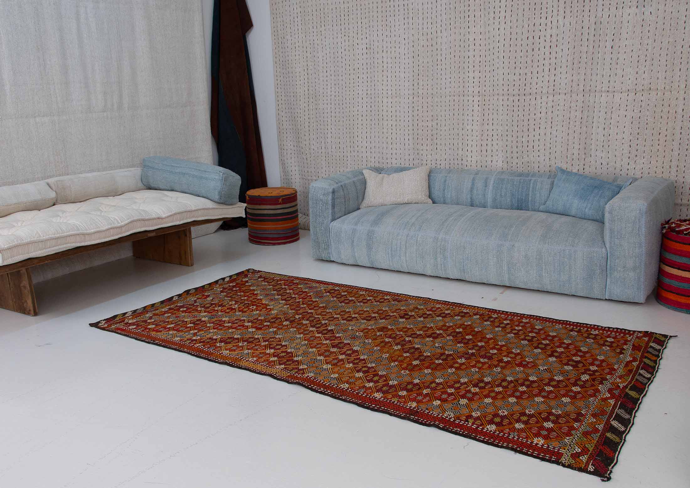 Its handwoven tapestry explodes with warm ruby reds and fiery oranges, each diamond shape ablaze with the sun’s kiss. Golden threads weave their way through, adding depth and dimension to this mesmerizing dance of geometry. This isn’t just a Vintage jejim kilim rug; it’s a portal to Anatolian tradition, inviting you to step into a world of rich colors and timeless craftsmanship.