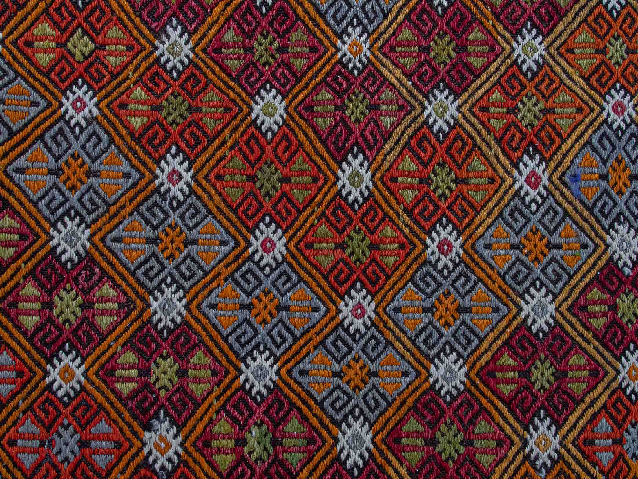 Jejim kilims, also known as cicim kilims, are flatweave wonders born from the looms of nomadic tribes in Anatolia. Woven without knots, their weft threads dance across the warp, painting vibrant stories onto the rug’s surface. Each diamond, each line, whispers of generations past, of skilled artisans pouring their nomadic spirit and dreams into every fiber.