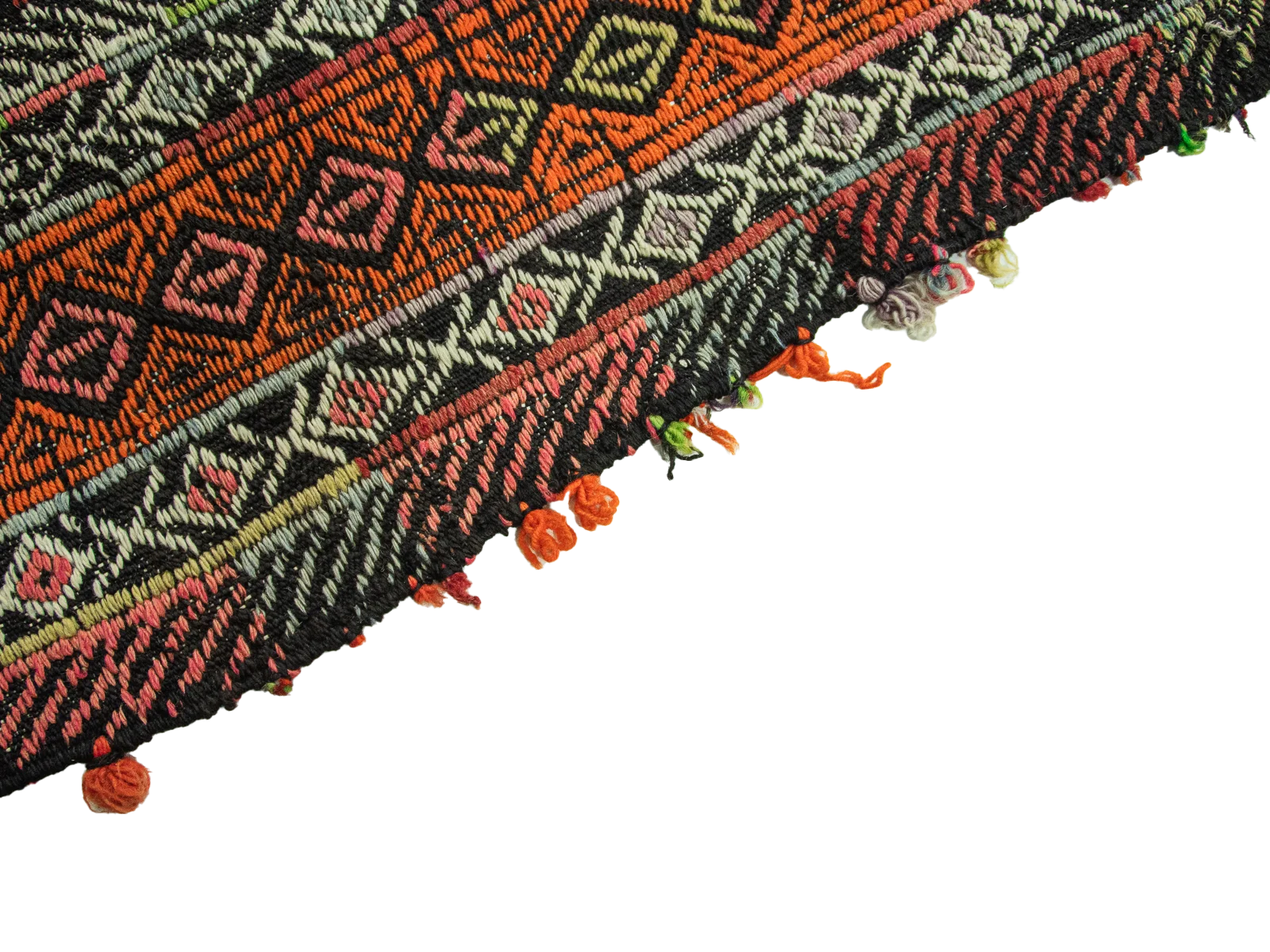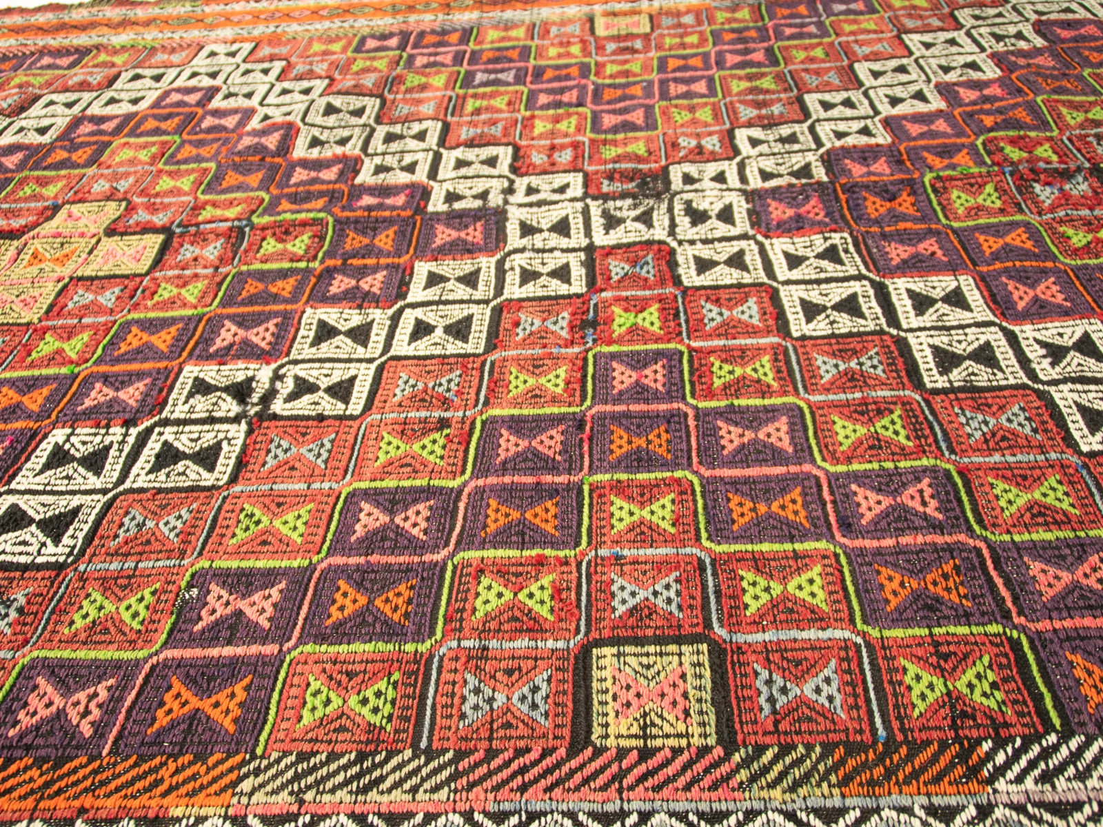 Its handwoven tapestry explodes with warm ruby reds and fiery oranges, each diamond shape ablaze with the sun’s kiss. Golden threads weave their way through, adding depth and dimension to this mesmerizing dance of geometry. This isn’t just a Vintage jejim kilim rug; it’s a portal to Anatolian tradition, inviting you to step into a world of rich colors and timeless craftsmanship.