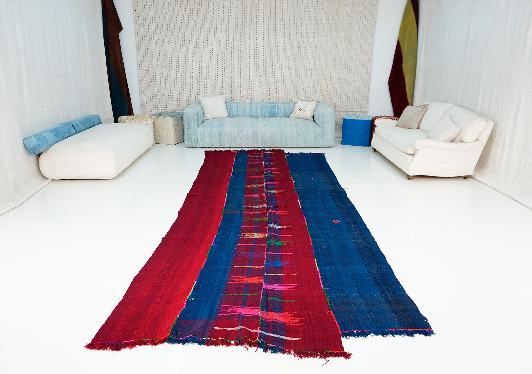 Vintage Kilim Perde Extra Long Runner Rug | Red Navy Blue Stripes