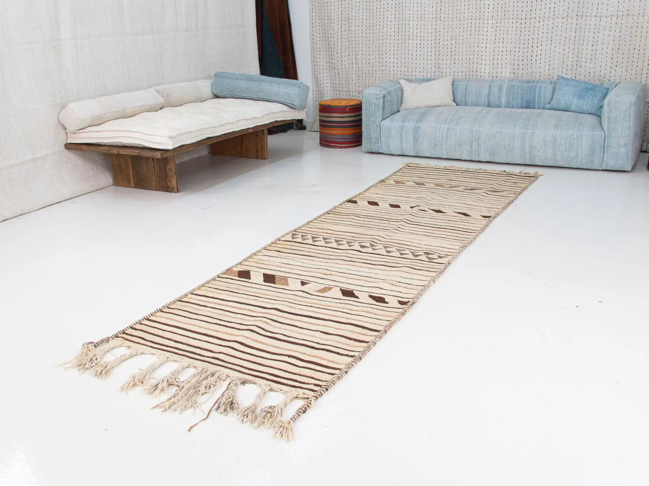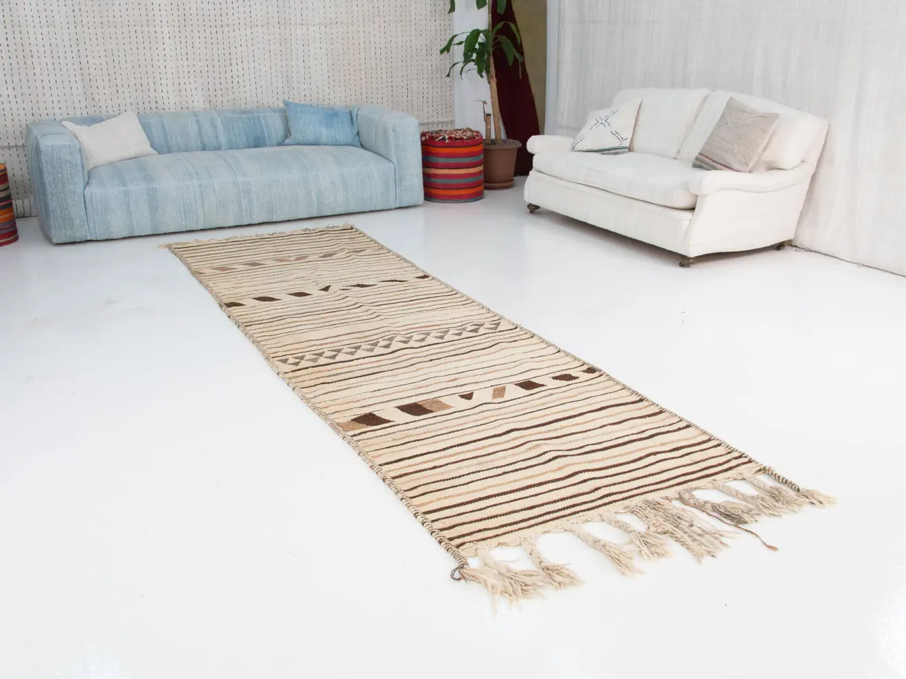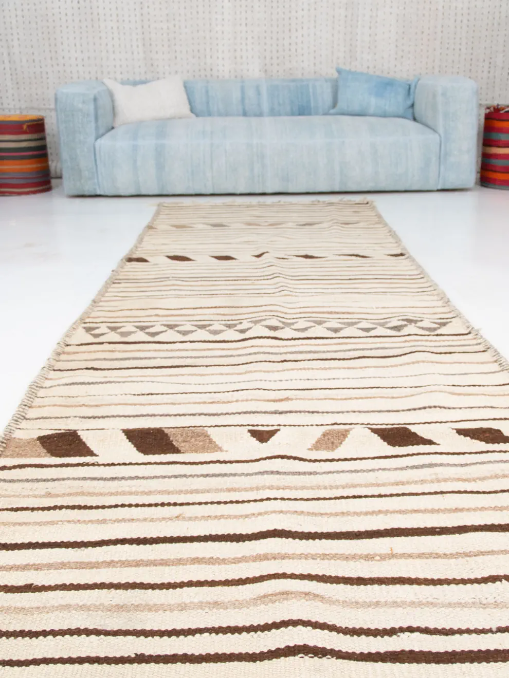 Unfurl a symphony of earthy elegance with this captivating vintage Anatolian kilim runner. Its handwoven tapestry shimmers with the warmth of sun-kissed sands, each stripe a harmonious blend of creamy ivory and rich brown hues. Imagine the gentle murmur of a desert breeze rippling through wheat fields, captured in the rhythmic dance of these stripes. This isn’t just a rug; it’s a timeless expression of Anatolian artistry, inviting you to step into a world of natural beauty and serenity.