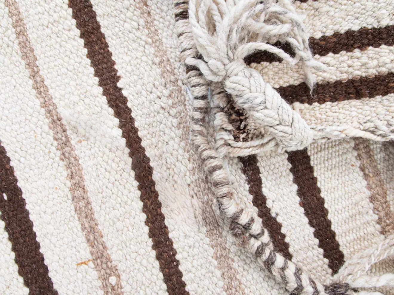 Picture the soft caress of pure organic wool underfoot as you glide along this vintage Anatolian kilim runner. Let its warm brown stripes add a touch of grounding presence to your hallway, guiding your steps with quiet elegance. Spread it across your kitchen floor, and create a haven of serene beauty for your culinary adventures. In your bedroom, it’s a calming path into dreams, the rhythmic stripes whispering lullabies of windswept plains.
