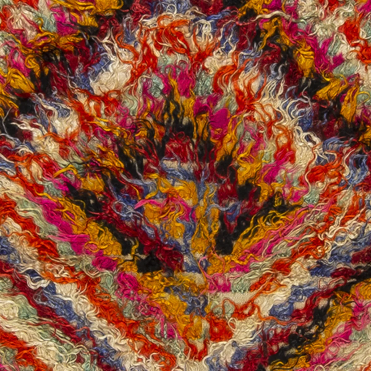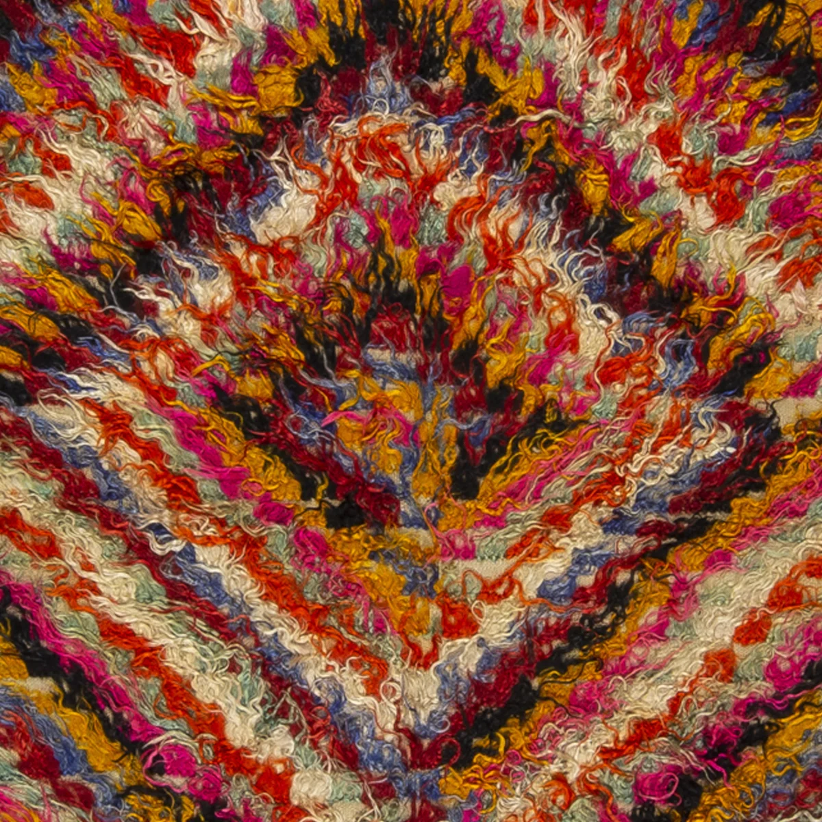 This vintage Tulu is a canvas of vibrant energy, handwoven in plush, shaggy organic wool. Imagine a kaleidoscope of red, yellow, and blue, each diamond shape dancing in joyful harmony. The high pile begs your bare feet to sink in, inviting you to surrender to the carefree spirit of this unique piece.