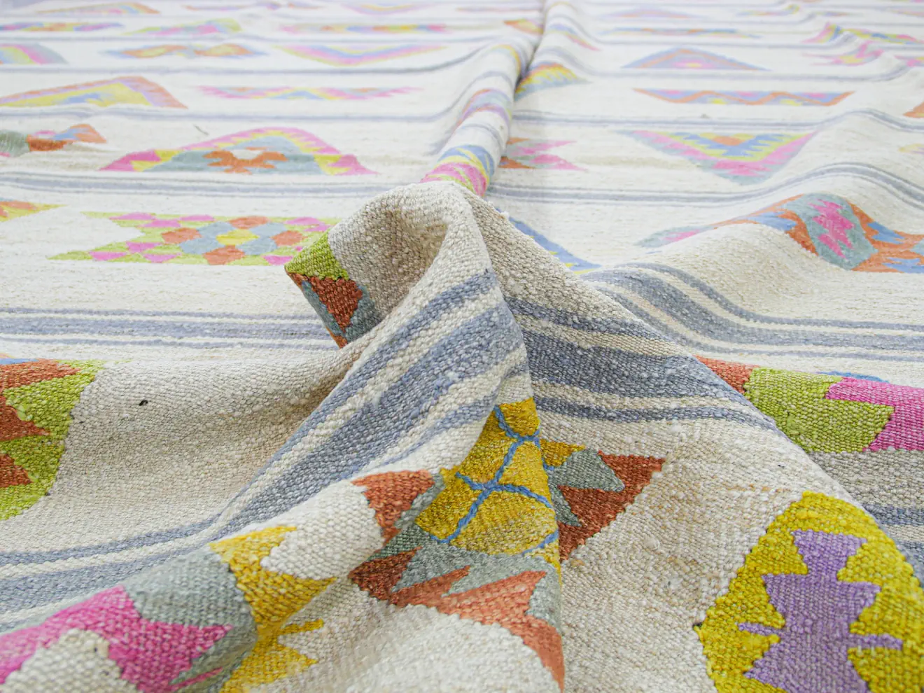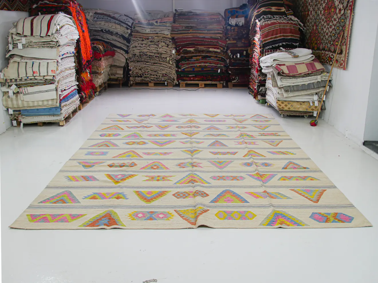 Embark on a journey through time and terrain with this monumental 10’6×13′ ft (320x397cm) flatweave kilim rug from Knotisse Fine Weavings. Step across a canvas of sun-bleached off-white, where ancient tribal patterns whisper tales of forgotten journeys.